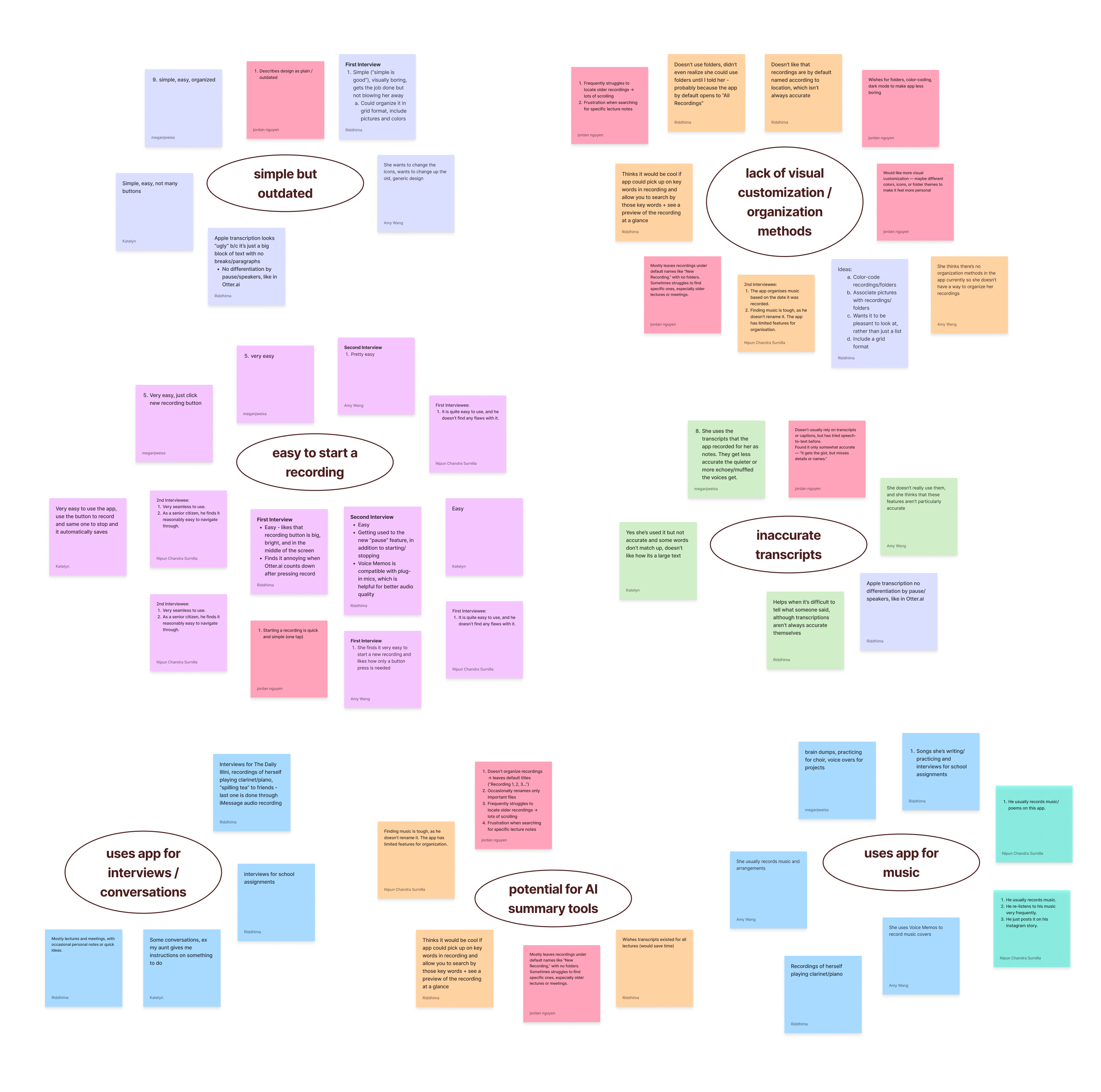 Our questions covered recording habits, organization, accessibility, and personalization. We clustered this data into common themes to reveal key insights.