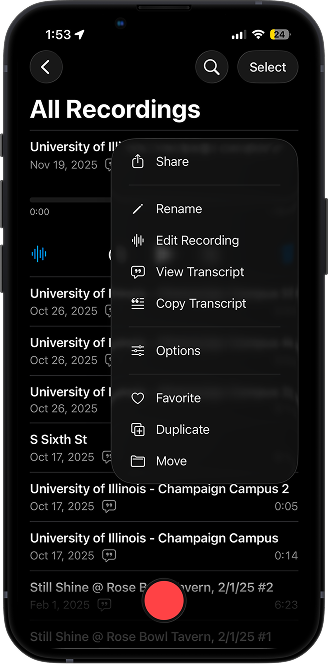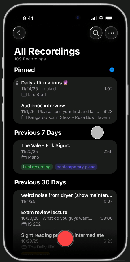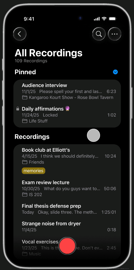 Long-press any recording to access quick actions like pinning and locking. Keep confidential files private and high-priority content at the top of your library, ensuring nothing gets buried.