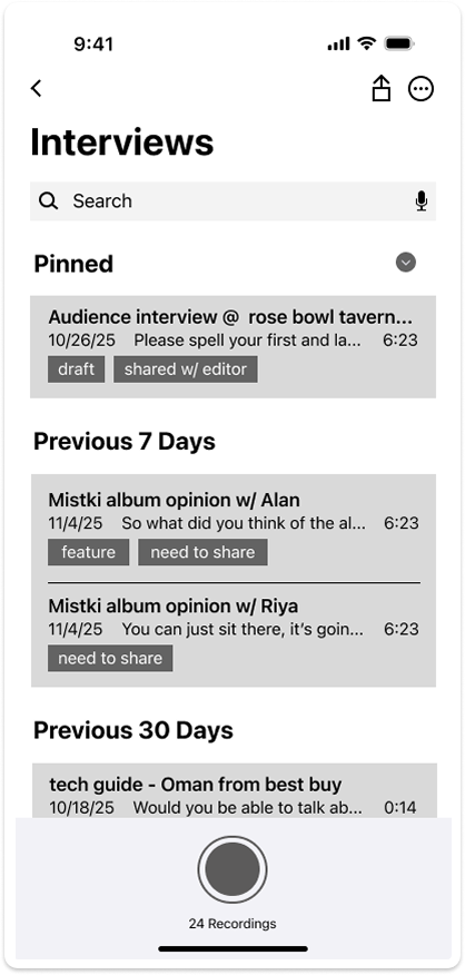 Searching through recordings is a tedious process. Users feel frustrated that they must listen to a file to know its contents, highlighting the need for context at a glance.